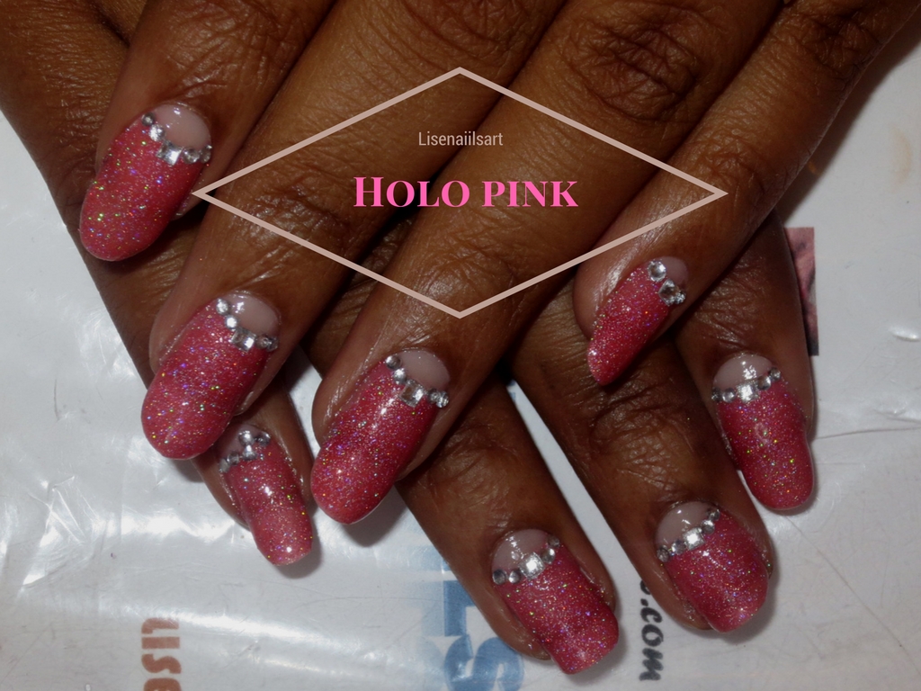 Pour ce faire, j'ai pris un super beau vernis Holographique de la marque Kleancolor il s'appelle Holo Pink # 134. Je n'applique pas le vernis sur tout l'ongle, j'ai donc mis du vernis du coté droit vers le trois quart de l'ongle, ensuite du coté gauche pareille et j'ai rempli le milieu pour avoir un arc de cercle.